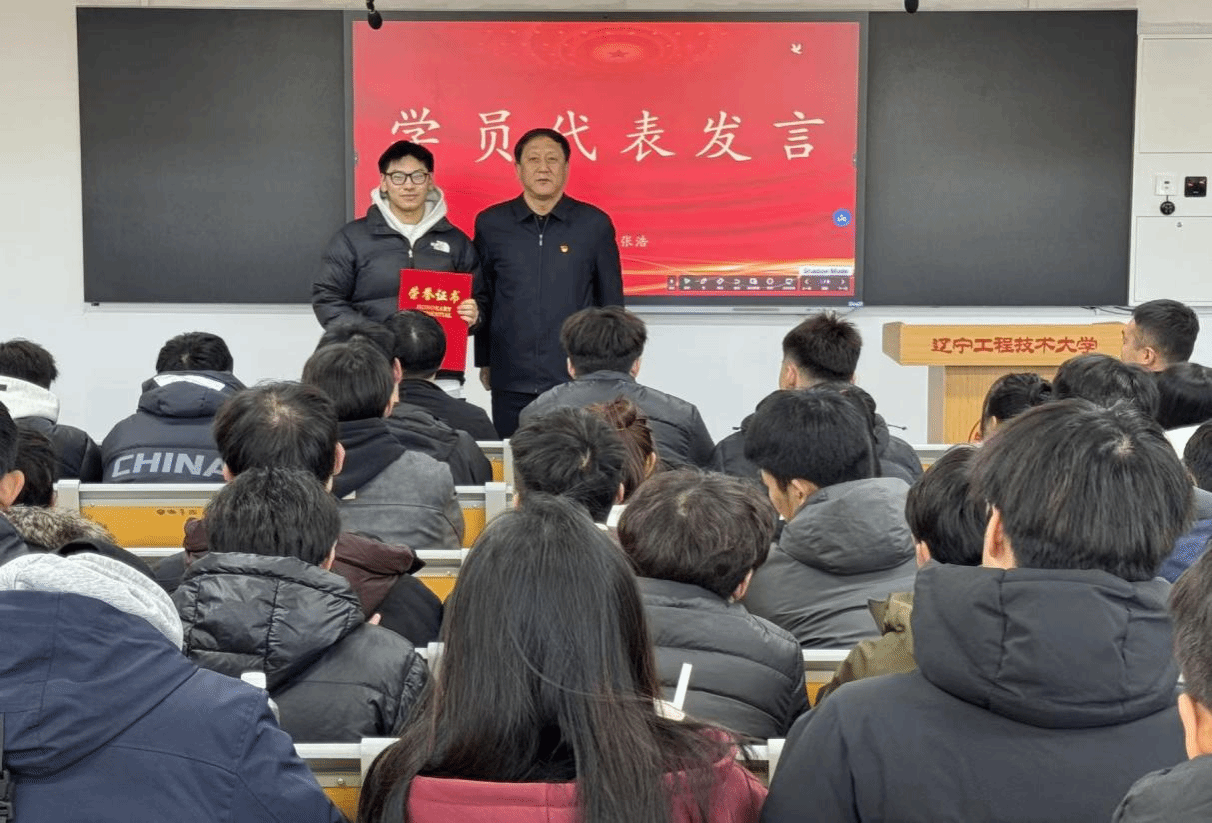 院党委书记田中雨为上学年院青马工程优秀学员代表杨鑫源同学颁发结业证书及优秀学员证书,并为本学年院青马工程培训班授旗,学员代表雷运生同学上台接旗。