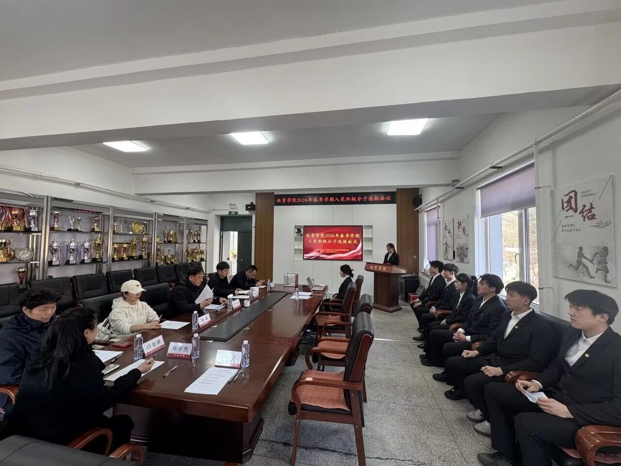 为进一步选拔和培养具有共产主义觉悟、忠诚党的事业、品行端正、能力较强的优秀共青团员加入党组织,切实做好学生党员后备力量储备工作,持续优化学生党员队伍整体结构、提升队伍综合素质,3月20日下午,体育学院在学院会议室举办2026年春季学期入党积极分子选拔面试。学院党委书记田中雨、正处级组织员张宝进、教工党支部书记刘颖、班导师代表白如娇、学工部主任兼学生党支部书记郑重、团委书记张一兵、教师代表孙卓然担任面试评委,面试由院团委书记张一兵主持。
