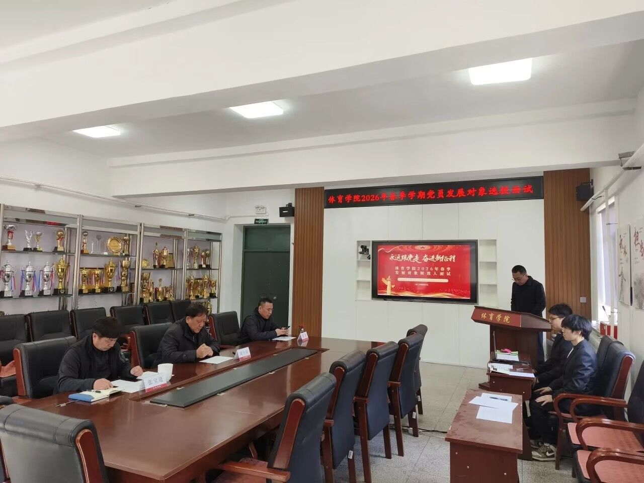 4月8日10时,体育学院在学院会议室举办了2026年春季学期党员发展对象选拔面试。院党委书记田中雨、正处级组织员张宝进、副院长陈雷担任评委,面试由院学生党支部书记郑重主持。